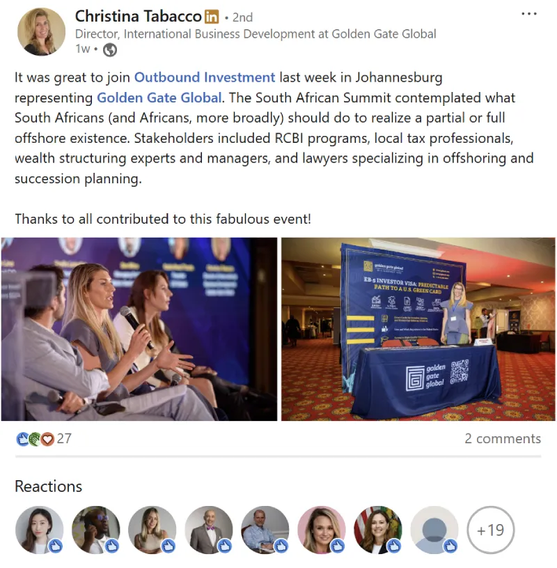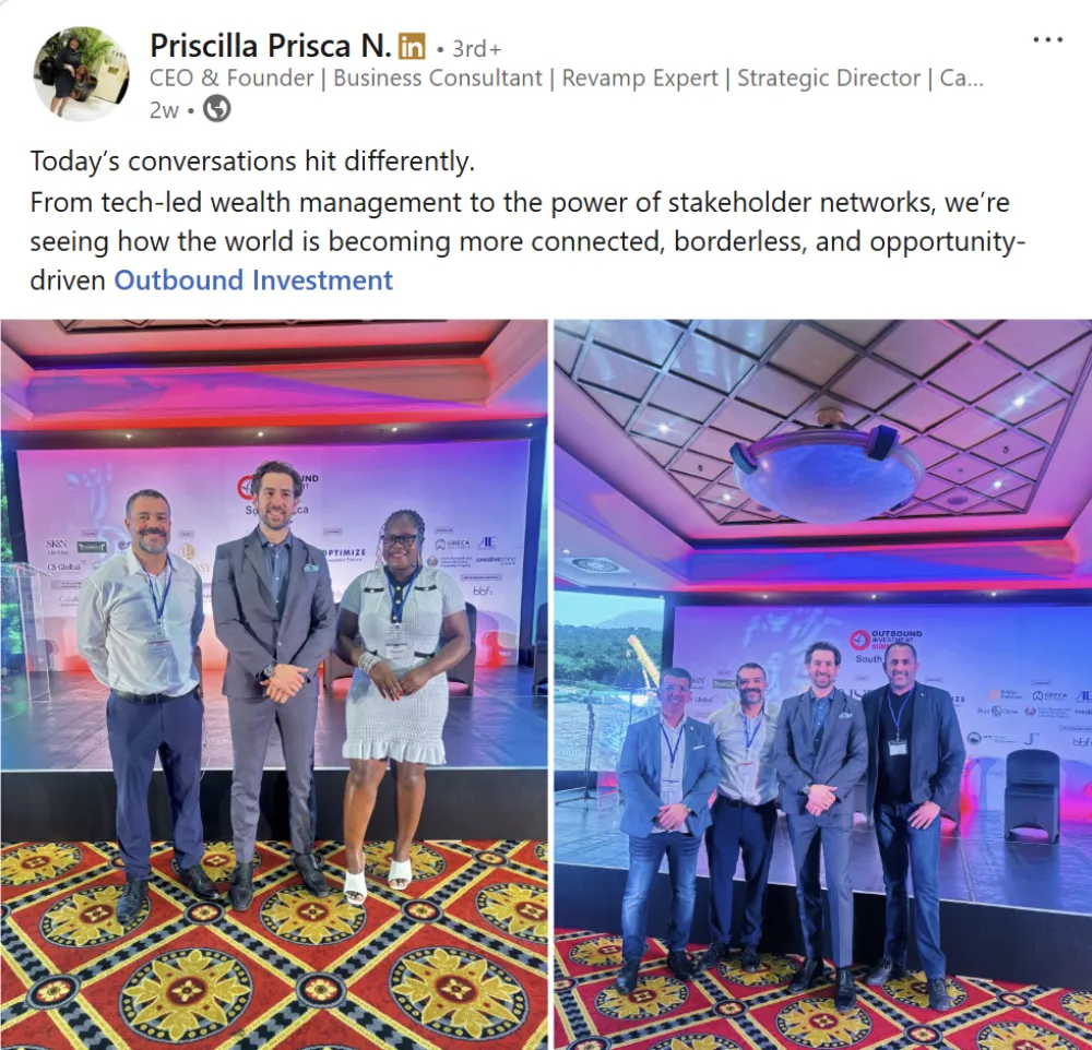 Join us on October 17th in Cape Town for the Outbound Investment Summit, an exclusive gathering designed for professionals across various industries, including finance, immigration, wealth management, consulting, legal, real estate, and more. This summit offers a unique opportunity to: