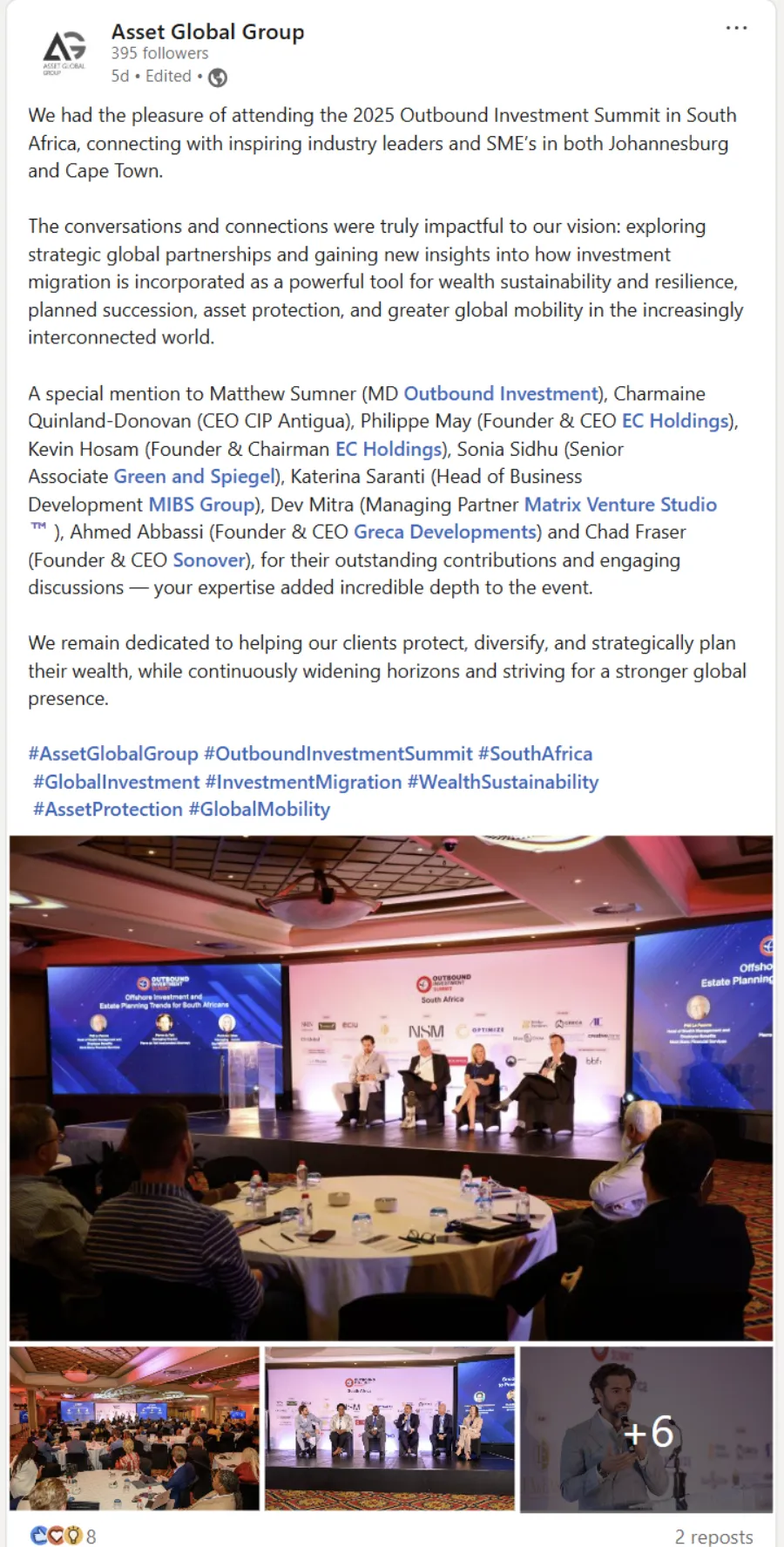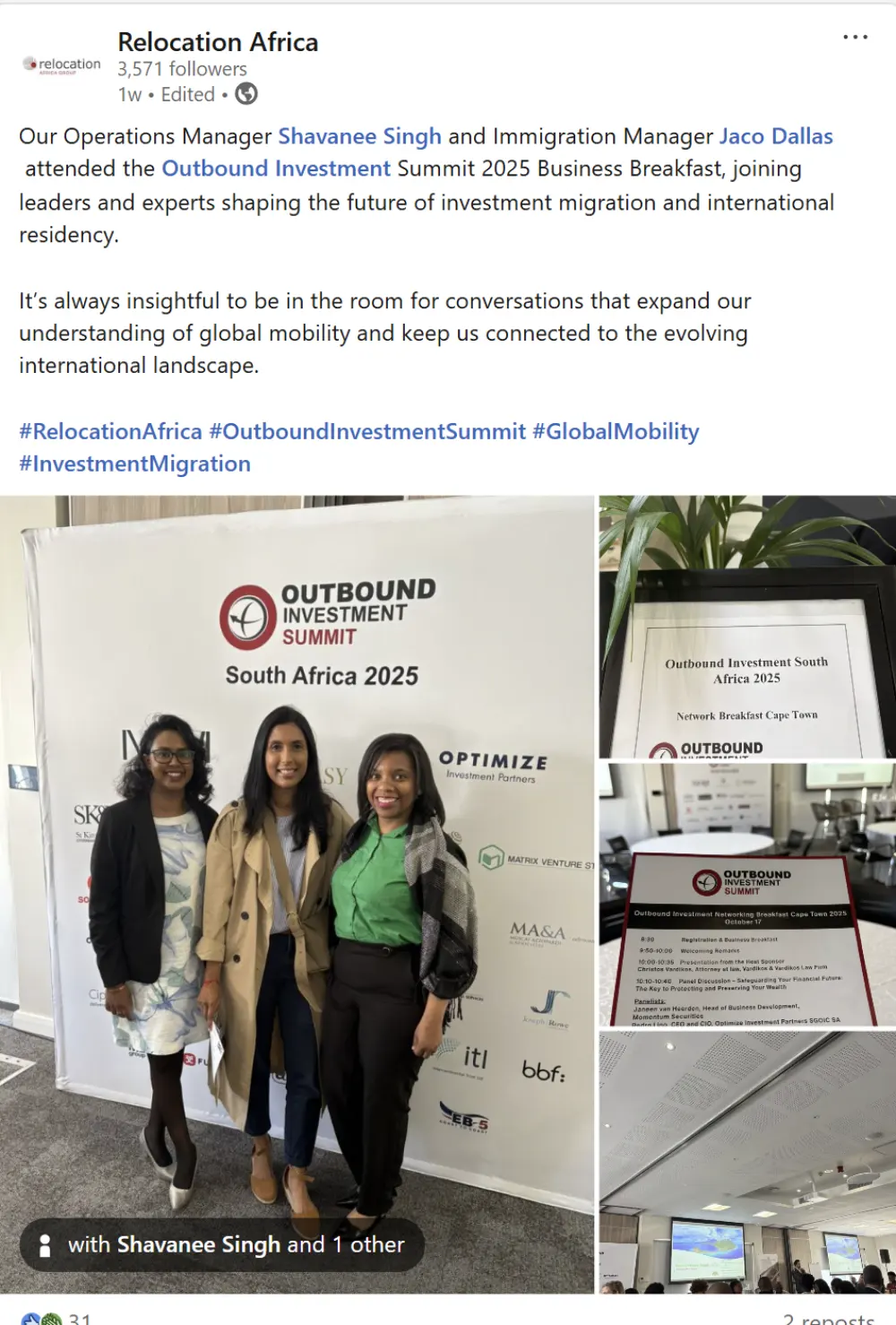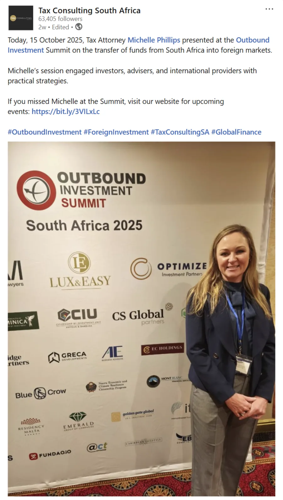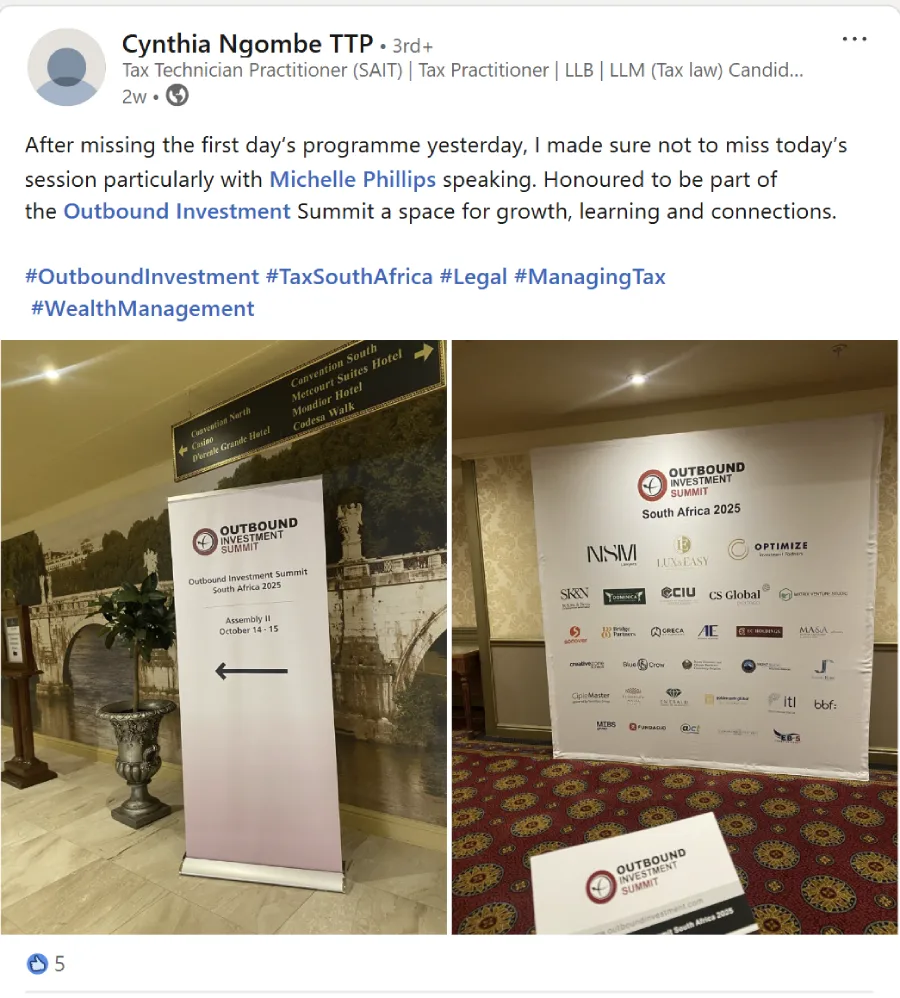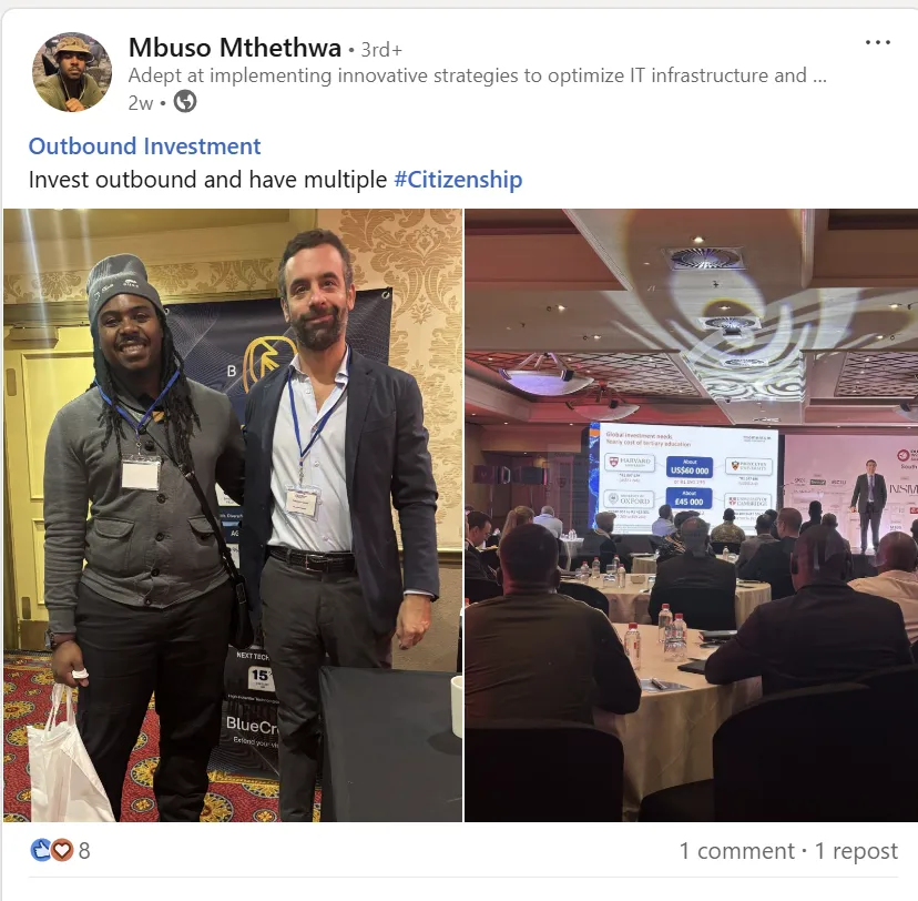 Join us on October 14th in Johannesburg for the Outbound Investment Summit, an exclusive gathering designed for professionals across various industries, including finance, immigration, wealth management, consulting, legal, real estate, and more. This summit offers a unique opportunity to: